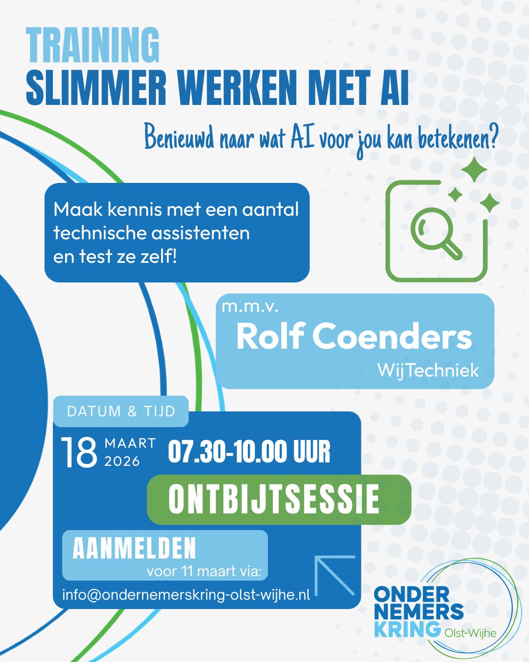 Aanmelden voor 11 maart via: info@ondernemerskring-olst-wijhe.nl
